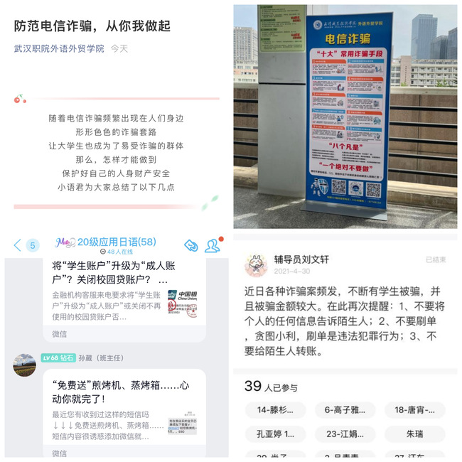 四月下旬,外语外贸学院制定《外语外贸学院开展防范治理电信网络新型违法犯罪专项行动方案》,并组织全体师生开展防诈骗主题教育,通过党支部、教研室、班级、团支部开展学习(防诈)安全知识小课堂,防诈骗常见手法、套路和防范措施,做到师生全覆盖。