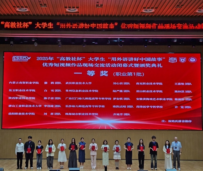 (通讯员吴娅敏)2025年9月19日至21日,由中国英汉语比较研究会指导,南京大学、江汉大学和高等教育出版社联合主办的2025年“高教社杯”大学生“用外语讲好中国故事”优秀短视频作品现场交流活动在江汉大学举行。我校外语外贸学院团队作品《Han Threads Renewed(汉绣新章)》荣获职业院校组全国一等奖,学校获“优秀组织单位”奖,指导教师汪洋获“优秀指导教师”。