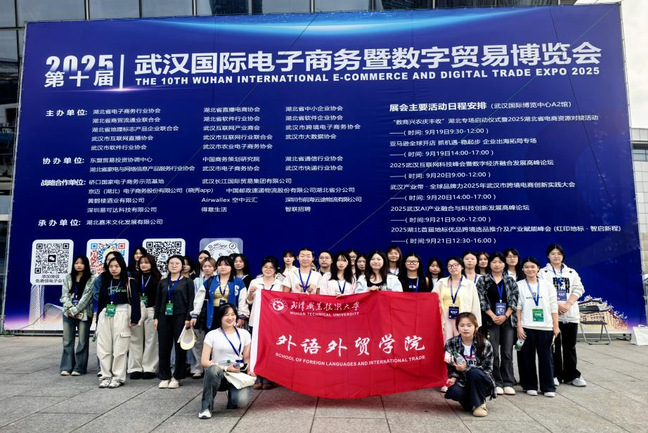 (通讯员聂晓琳)2025 年 9 月 20 日,外语外贸学院 2025 级商务英语、应用英语、应用日语和应用法语四个专业的 40 名大一新生,在专业教师的带领下前往武汉国际博览中心,参加由武汉市商务局指导,湖北省电子商务行业协会和三头六臂跨境电商联盟主办、武汉市跨境电商协会协办的 2025 年武汉国际电子商务暨数字贸易博览会。本次活动是学院为专业新生特别设计的职业认知实践环节,旨在帮助学生深入理解语言技能在跨境数字贸易中的实际应用,搭建从课堂学习到行业实践的桥梁。