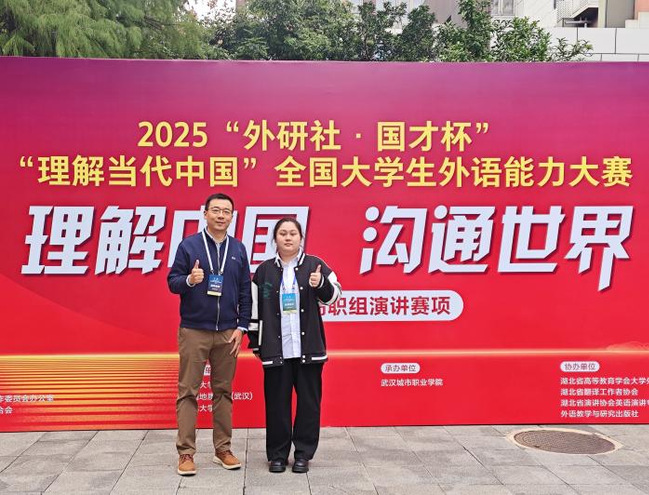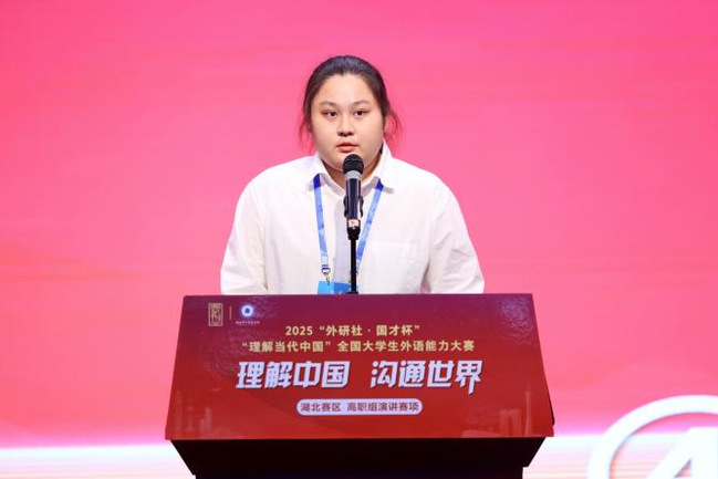 (通讯员:聂钟鸣、李亮)2025年10月25日至26日,由湖北省教育厅等单位主办、武汉城市职业学院承办的2025“外研社·国才杯”“理解当代中国”全国大学生外语能力大赛(湖北赛区)高职组演讲赛项圆满落幕。我校外语外贸学院2023级商务英语专业黄诗婷同学凭借出色发挥,在全省101名选手中勇夺金奖第三名,荣获国赛参赛资格。