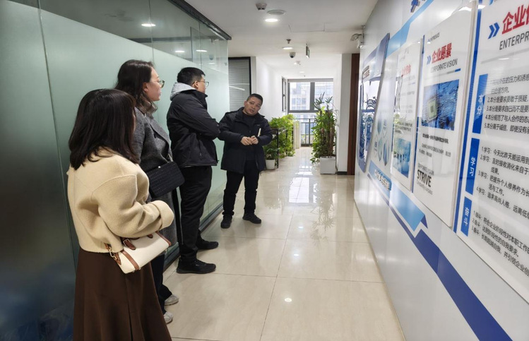 在思秒科技人事部李经理陪同下,学院团队参观了公司办公环境与文化展示区。公司总监吴先生详细介绍了企业发展历程、核心业务及“创新、协作、担当”的企业文化,展现了其在外贸与技术领域的扎实积累与创新活力,让校方对企业运营实际形成了直观而深入的认识与了解。