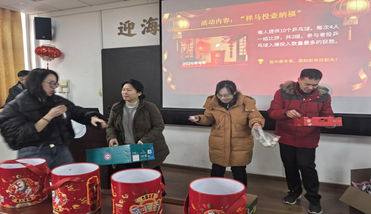 活动现场以中国红为主色调,灯笼高悬、春联盈门、福字点缀,洋溢着一派传统节日的温馨与热烈。教职工们在“马字飞花令”中吟诗接龙,在“马年倒福”中妙语连珠,在“祥马投壶纳福”中体验古礼雅趣。一系列富含文化意蕴的互动环节,不仅彰显了外语外贸学院教职工的人文素养,更在轻松愉快的氛围中深化了对春节文化内涵的理解与传承。
