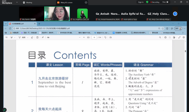 本次教学任务本次教学任务由外语外贸学院牵头组织并具体实施,吴娅敏、黄小蕊、王曦、王超然四位教师组成专业教学团队,共同承担并出色完成了全部教学工作。针对学生中文基础差异,团队采取分层教学模式:初级班从拼音与基础会话入手,完成HSK1教材前七课内容;中级班则系统学习HSK2教材前十一课,提升综合运用能力。团队灵活应对中印尼时差,将课程安排在北京时间午间与傍晚,并借助线上工具高效开展教学互动、作业批改与反馈。通过使用互动式PPT题库及自主设计的HSK真题练习,有效增强了学习体验与教学实效。