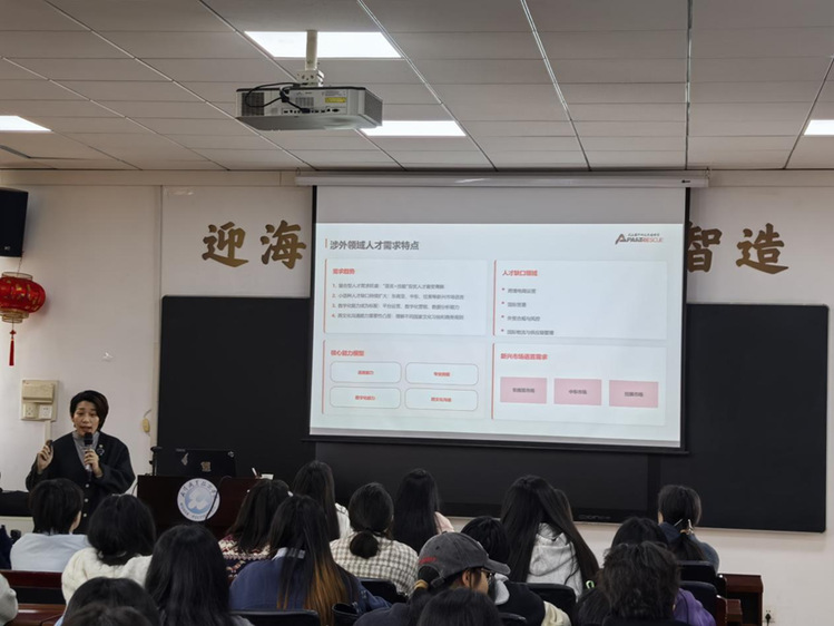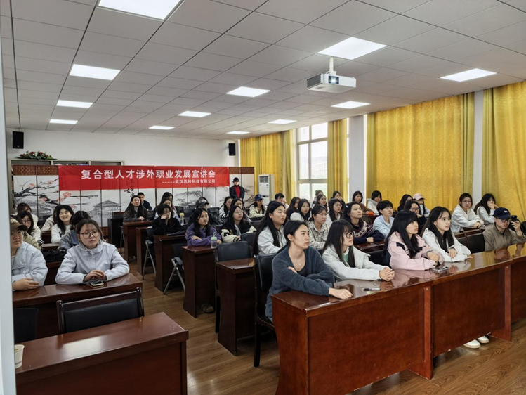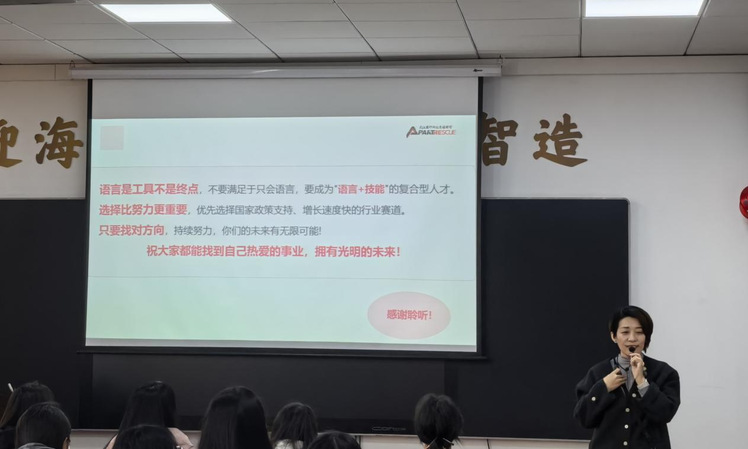 (通讯员聂娜)4月23日,外语外贸学院“企业专家进校园”系列讲座在凌峰楼A301举行。活动聚焦非通用语种专业学生职业发展,特邀武汉思秒科技有限公司培训与人才发展负责人肖晶担任主讲,应用法语、应用日语专业2024级学生全员参与。