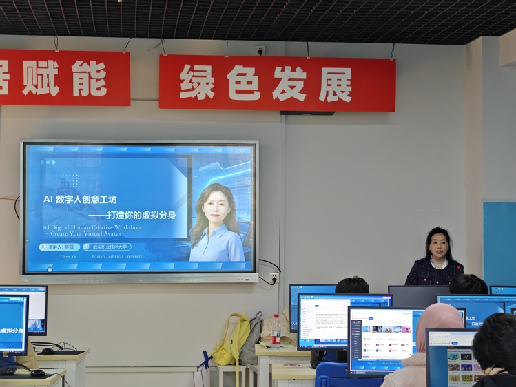 (通讯员杨小雨)11月20日下午,武汉职业技术大学凌峰楼B308教室“燃”起创意热潮!“AI数字人创意工坊:打造你的虚拟分身”留学生教学实践活动精彩上演。来自哈萨克斯坦、俄罗斯、吉尔吉斯斯坦等11个国家的28名留学生齐聚一堂,在主讲教师陈觎指导下玩转 AI工具、打造专属虚拟分身,在跨时空的互动中碰撞技术火花、感受中国诗韵,开启了一段融合人工智能技术与中国诗韵文化的奇妙实践之旅。
